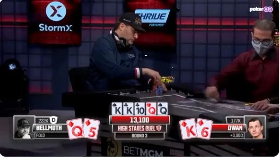 Dwan现在做了一个底池大小的加注,Hellmuth甚至10秒钟不到就弃掉了第三大坚果牌。