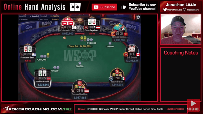 Joachim作为不想在筹码最少的Isaac Baron之前出局的中筹码,应该用宽范围加注。他在这里全压就好,而且由于一名短筹码即将出局的牌桌动态,这种玩法往往会迫使桌上的进攻者弃牌。