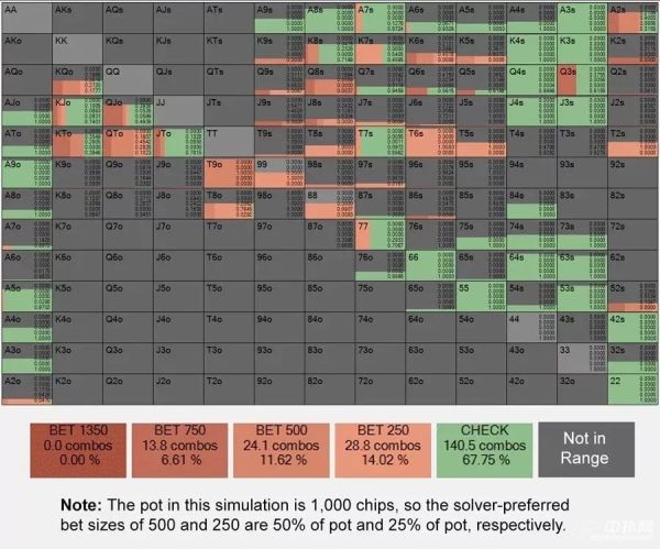 模拟底池为1000码量,软件更偏向500和250这两种下注量,分别占了底池的50%和25%。